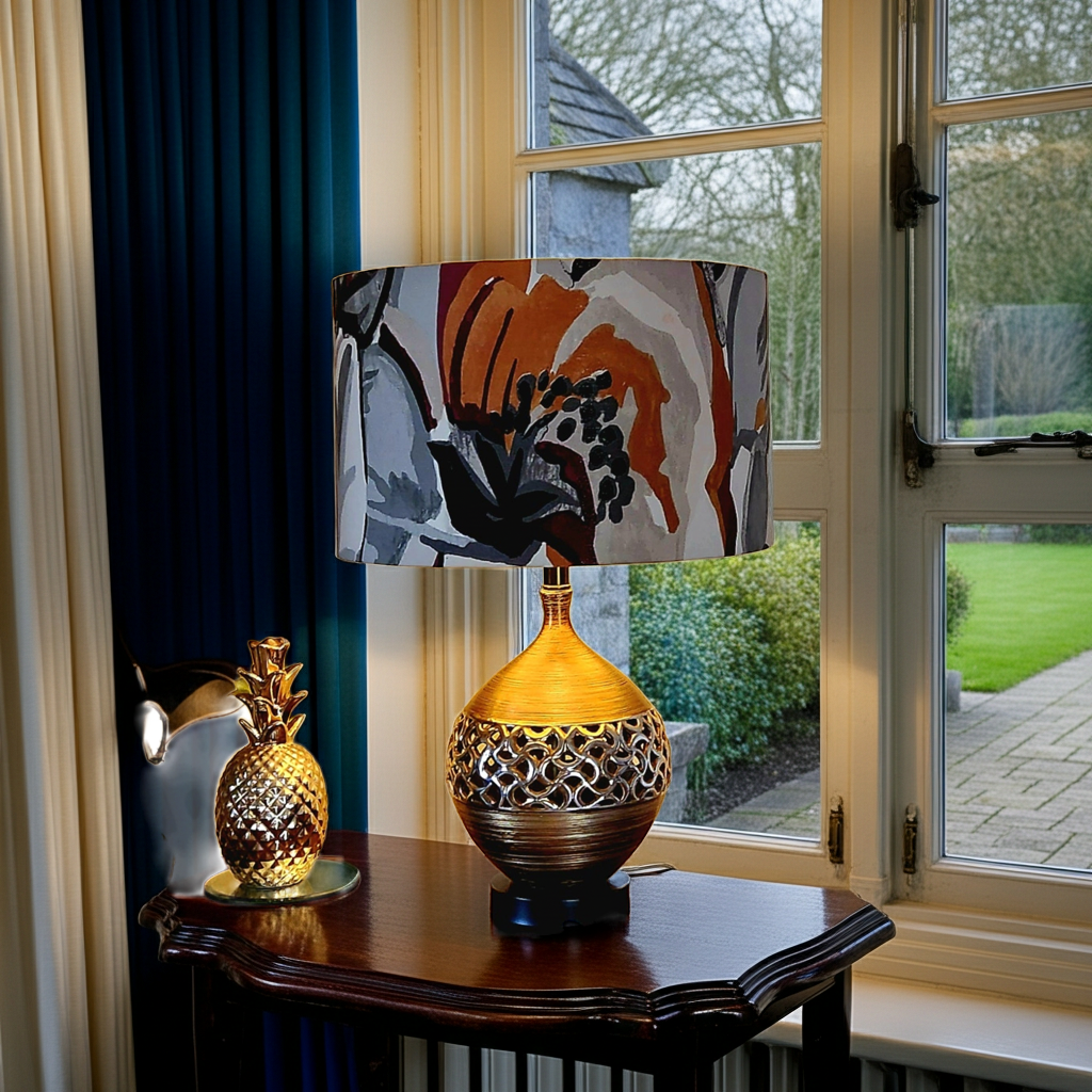 More than a lampshade, this is a piece of art for your home. With painterly brushstrokes that hint at abstract flora, this design layers burnished copper and bronze tones with deep mahogany, burgundy, and splashes of grey and black. Every angle reveals new depth, like a canvas alive with movement and mood.